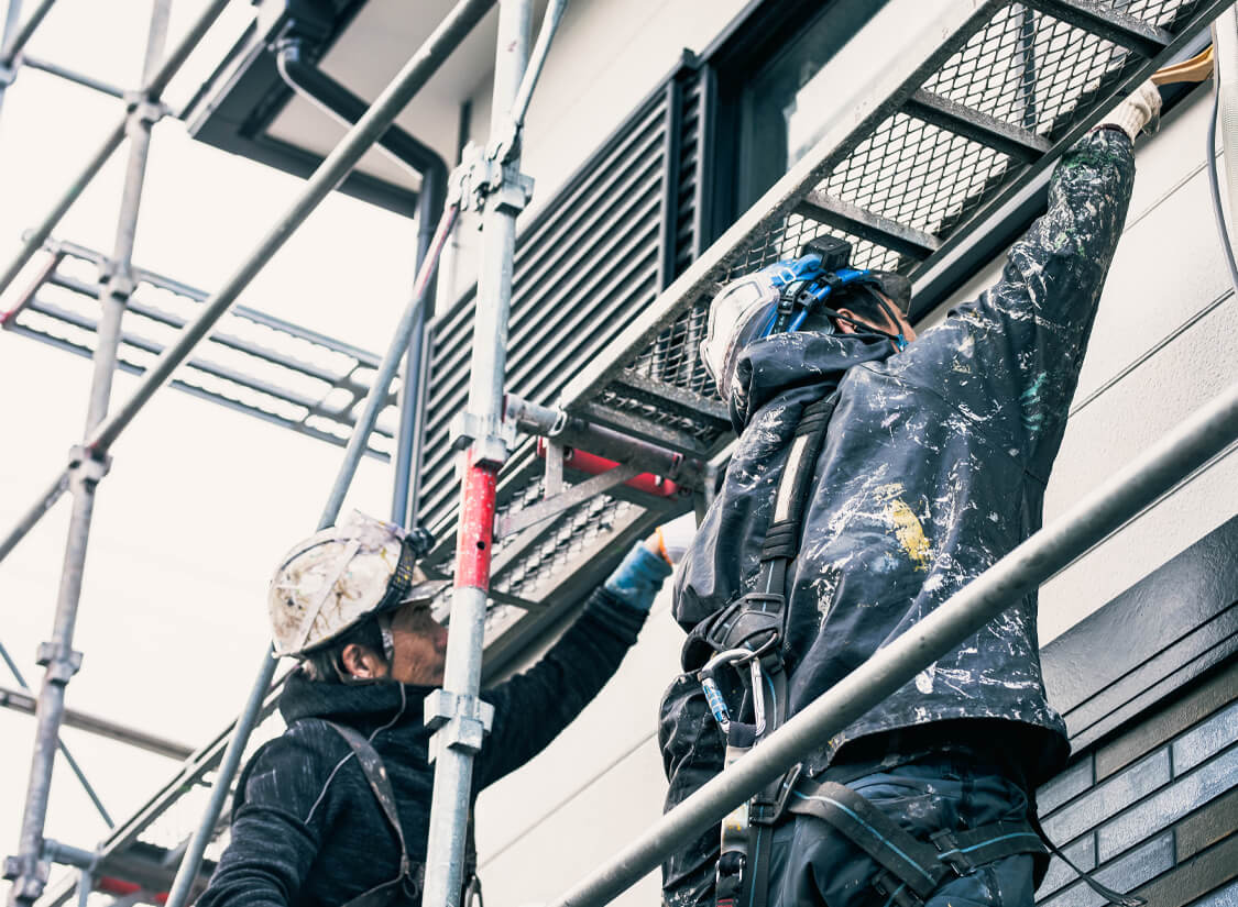 内容にご納得いただけましたらご契約となり、工事を開始します。着工前には、スタッフが近隣の皆さまへご挨拶に伺い、工期や注意点をご説明します。高圧洗浄・ひび割れ補修・ケレンなどの下地処理を行い、下塗り・中塗り・上塗りの3工程を丁寧に重ねて仕上げます。